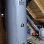 Om fors te besparen op de gasrekening en al vast de eerste stap te zetten naar gasloos wonen, hebben we een zonneboiler systeem geplaatst in de nieuwbouw van een arbeiderswoning. De zolder was net hoog genoeg om te boiler te plaatsen. Het na-verwarmen, als er minder zon is en er wel behoefte is aan warm tapwater, hebben we met een liggende, elektrische boiler gedaan. De aansluitingen in de nieuwe badkamer hebben we ook gemaakt, met twee tijdelijke leidingen naar de bestaande badkamer.