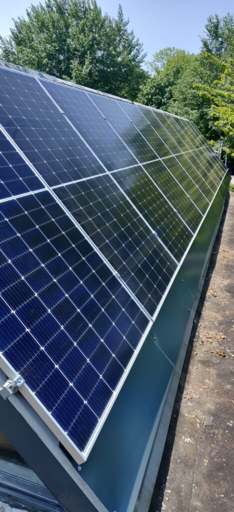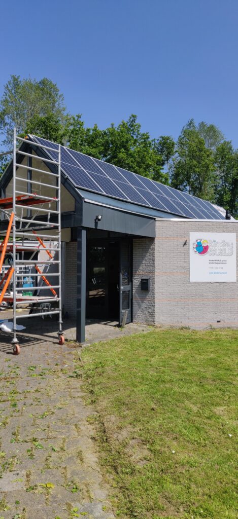 We hebben voor het kinderdagverblijf van Kinder world in Almere het dak van de entree vol gelegd met 24 zonnepanelen van 500wp.