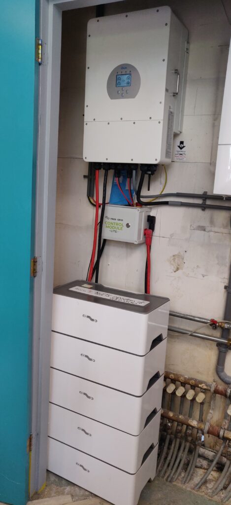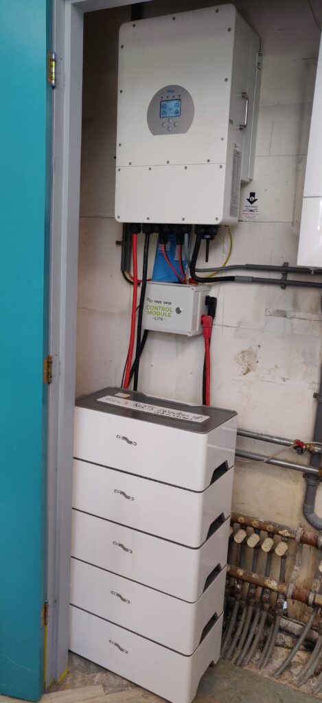 Om alles compleet te maken, zo goed mogelijk onze eigen energie te gebruiken en het net te beschermen tegen hoge afname en terugleveringen, hebben we ook een accu geplaatst met hybride omvormer. Deze zorgt er voor dat pieken qua verbruik en teruglevering afgezwakt worden.