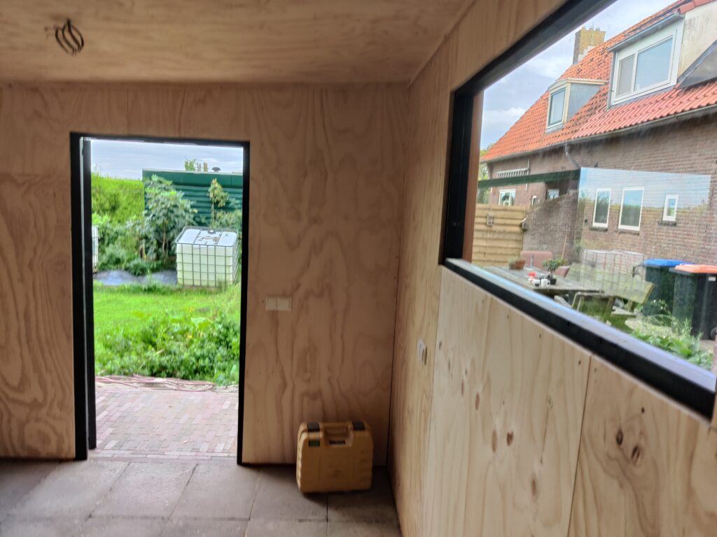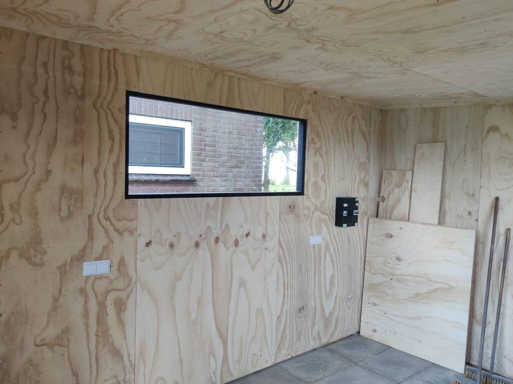 Ook hebben we hier het isoleren en aftimmeren van de nieuwe schuur uitgevoerd om opslagruimte te creëren. Na het plaatsen van de pir isolatie zijn de wanden en het plafond voorzien van 18mm plaatwerk. Ook hebben we hier stopcontacten en schakelaars in weg gewerkt en de voorbereidingen gemaakt voor extra zonnepanelen
