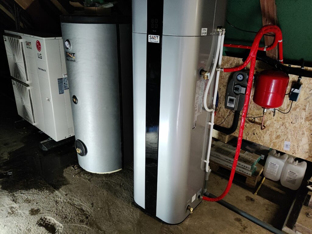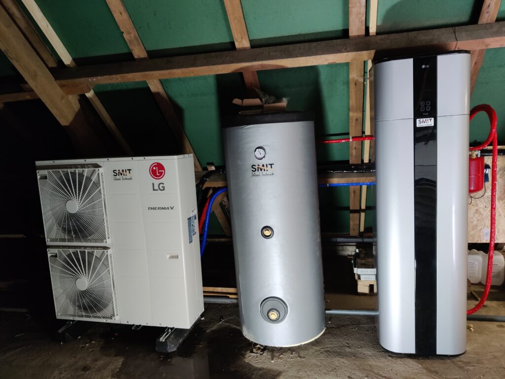 Voor het verwarmen hebben we gebruik gemaakt van een LG TermaV 14kw warmtepomp die samen met een indirecte boiler ook een groot deel van het tapwater voor zijn rekening neemt.