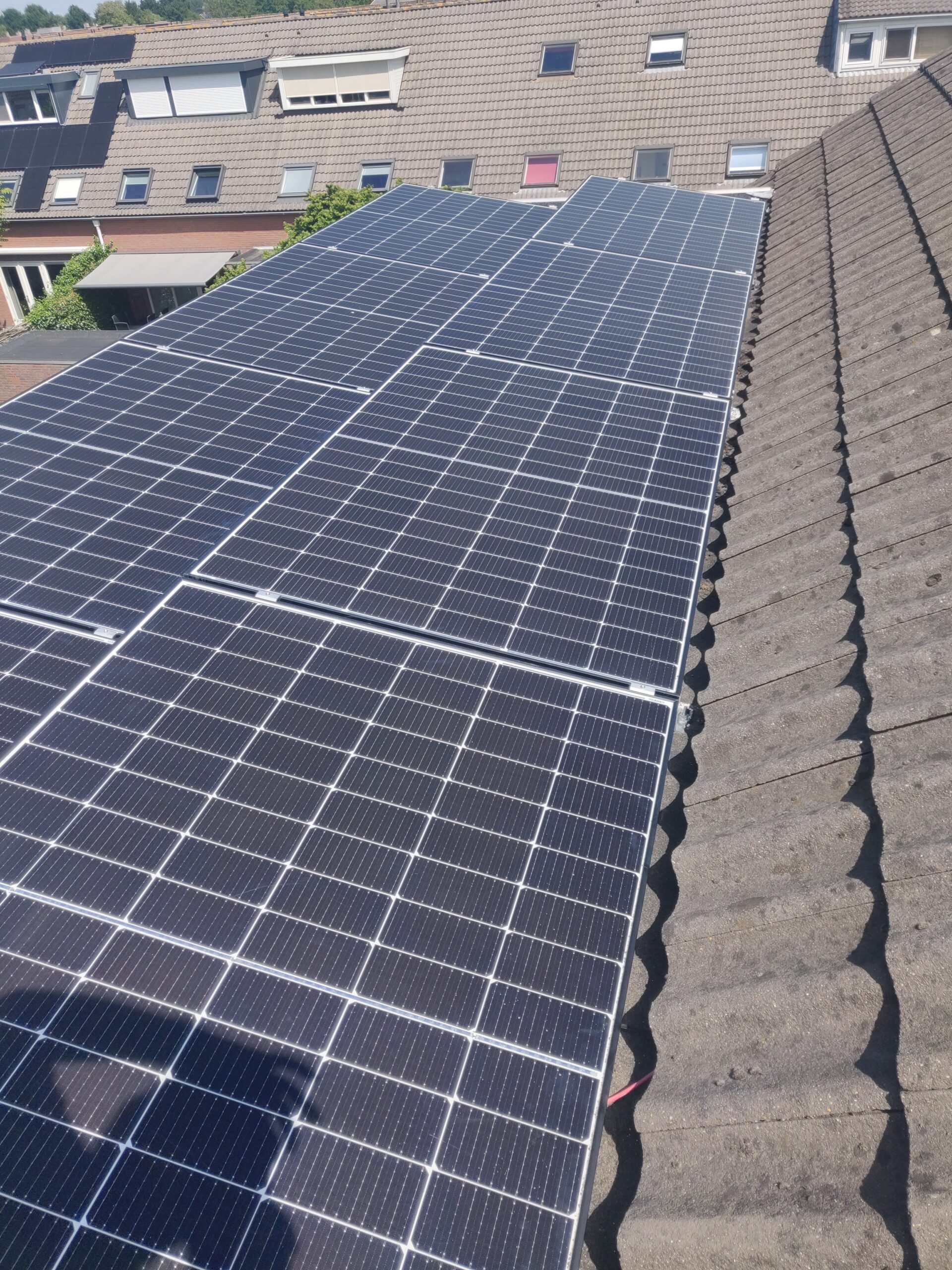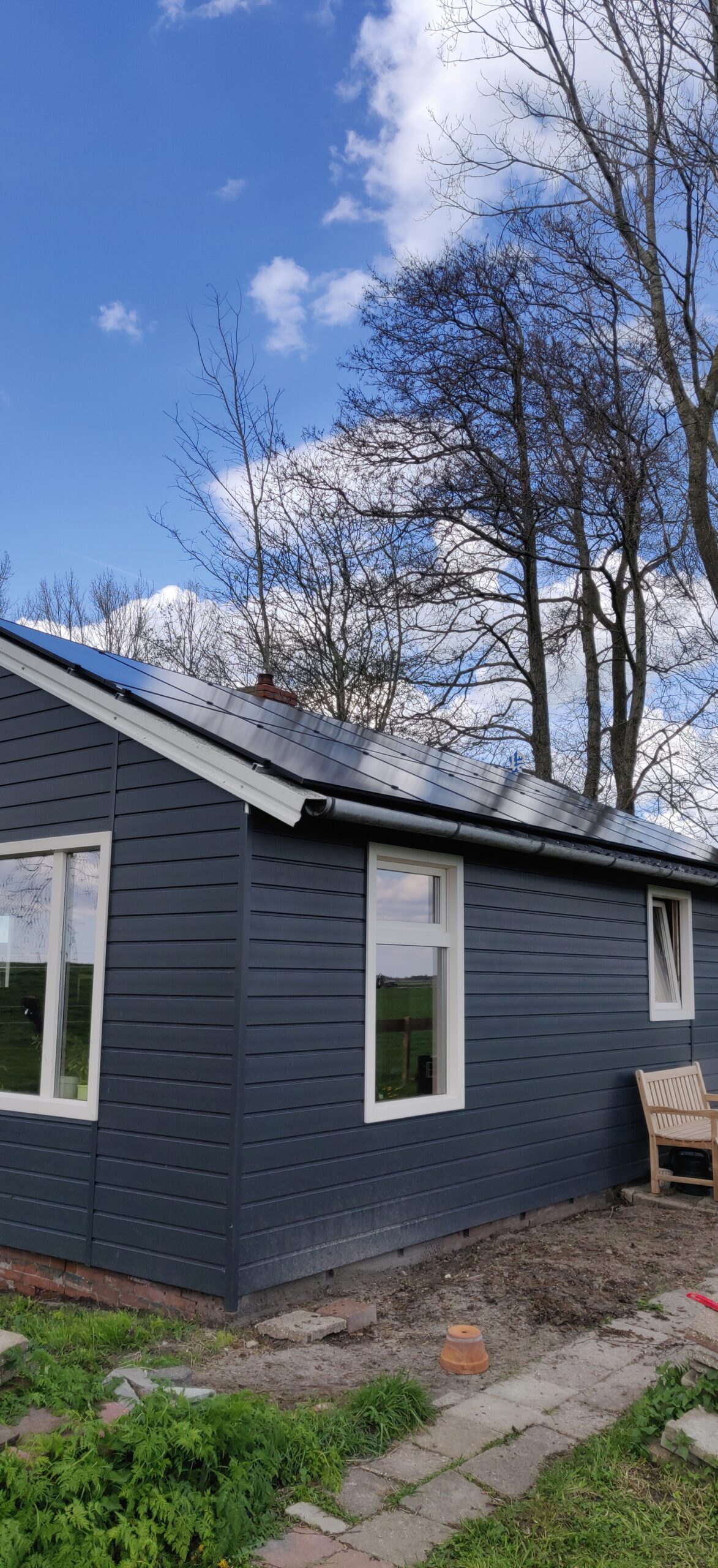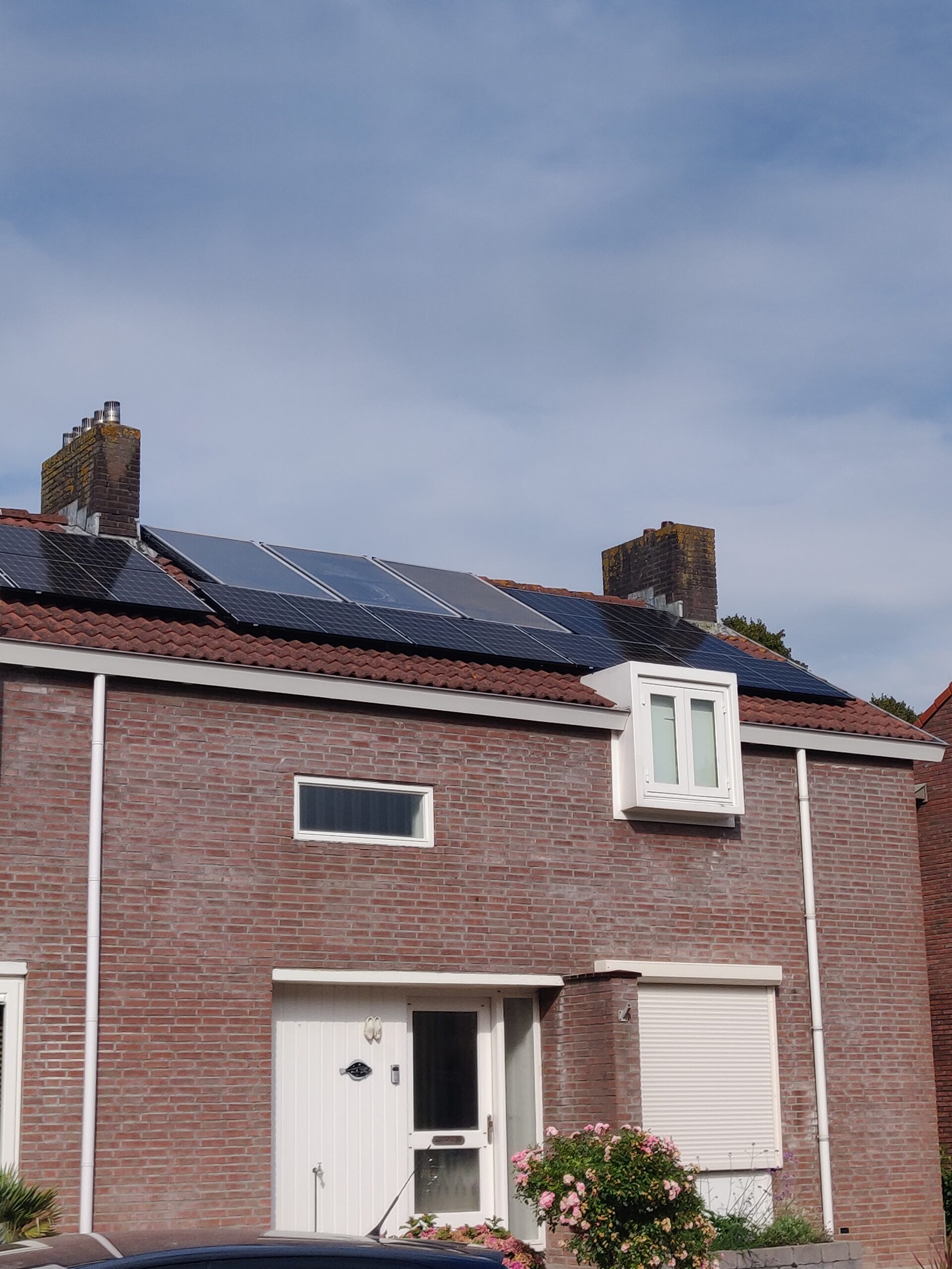 Als je dan toch op een van de mooiste plekjes woont van de regio, uitzicht over de landerijen en de koeien/paarde/schapen bijna in je voortuin, dan is het natuurlijk een stimulans om ook groen uit te stralen. We hebben hiervoor al eerder een elektrische boiler geplaatst om het huis(je) te voorzien van warm tapwater. Ook zijn alle elektra leidingen en waterleidingen vervangen naar de huidige maatstaven. Net als de groepenkast die met 2 groepen wel erg krap was. De volgende stap was het opwekken van eigen zonne-energie. Door op het dak 14 panelen te plaatsen, op Esdec profielen, konden we ook de verzakking in het dak vlak strijken. Nu samen met de klant kijken naar de volgende stappen.