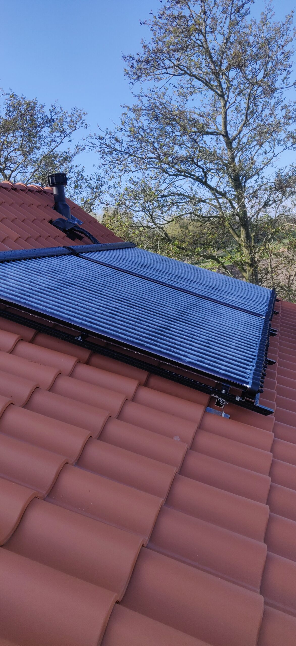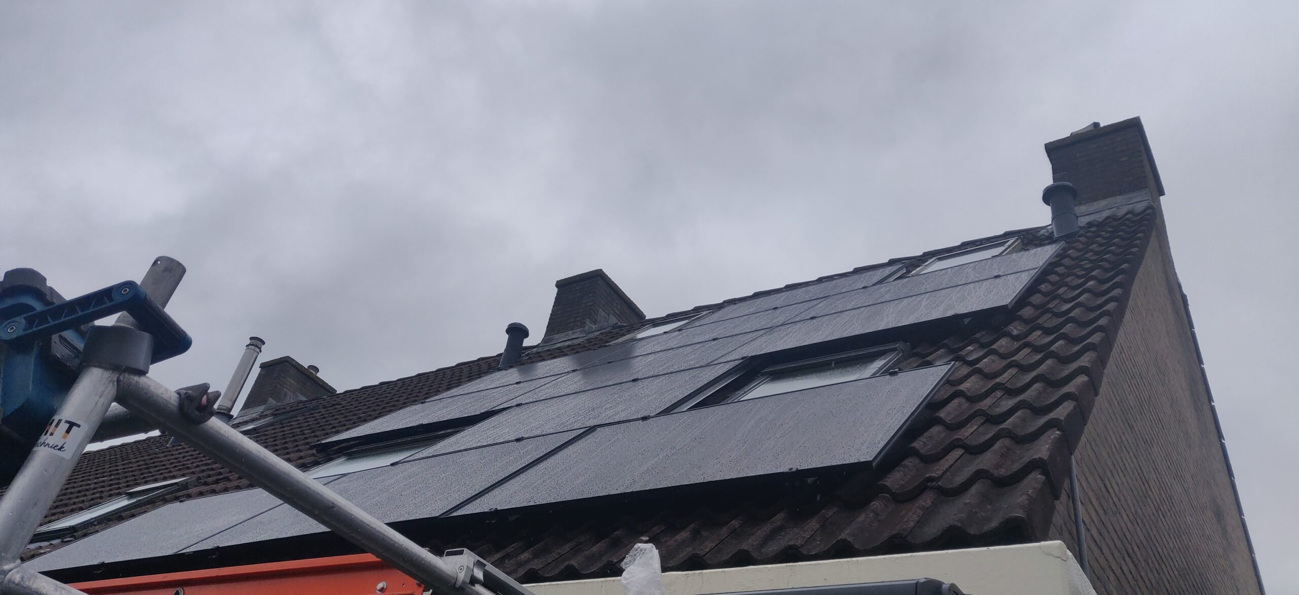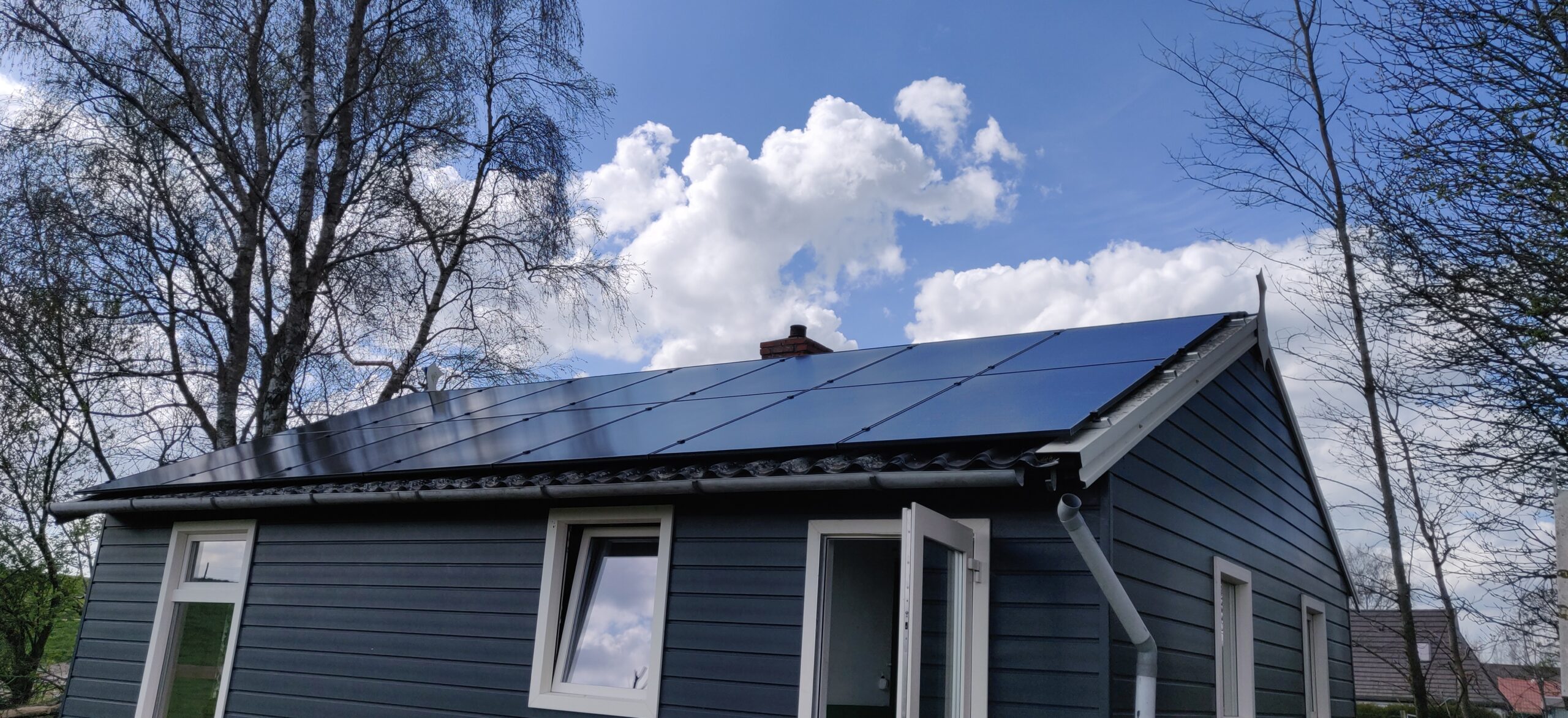 Als je dan toch op een van de mooiste plekjes woont van de regio, uitzicht over de landerijen en de koeien/paarde/schapen bijna in je voortuin, dan is het natuurlijk een stimulans om ook groen uit te stralen. We hebben hiervoor al eerder een elektrische boiler geplaatst om het huis(je) te voorzien van warm tapwater. Ook zijn alle elektra leidingen en waterleidingen vervangen naar de huidige maatstaven. Net als de groepenkast die met 2 groepen wel erg krap was. De volgende stap was het opwekken van eigen zonne-energie. Door op het dak 14 panelen te plaatsen, op Esdec profielen, konden we ook de verzakking in het dak vlak strijken. Nu samen met de klant kijken naar de volgende stappen.