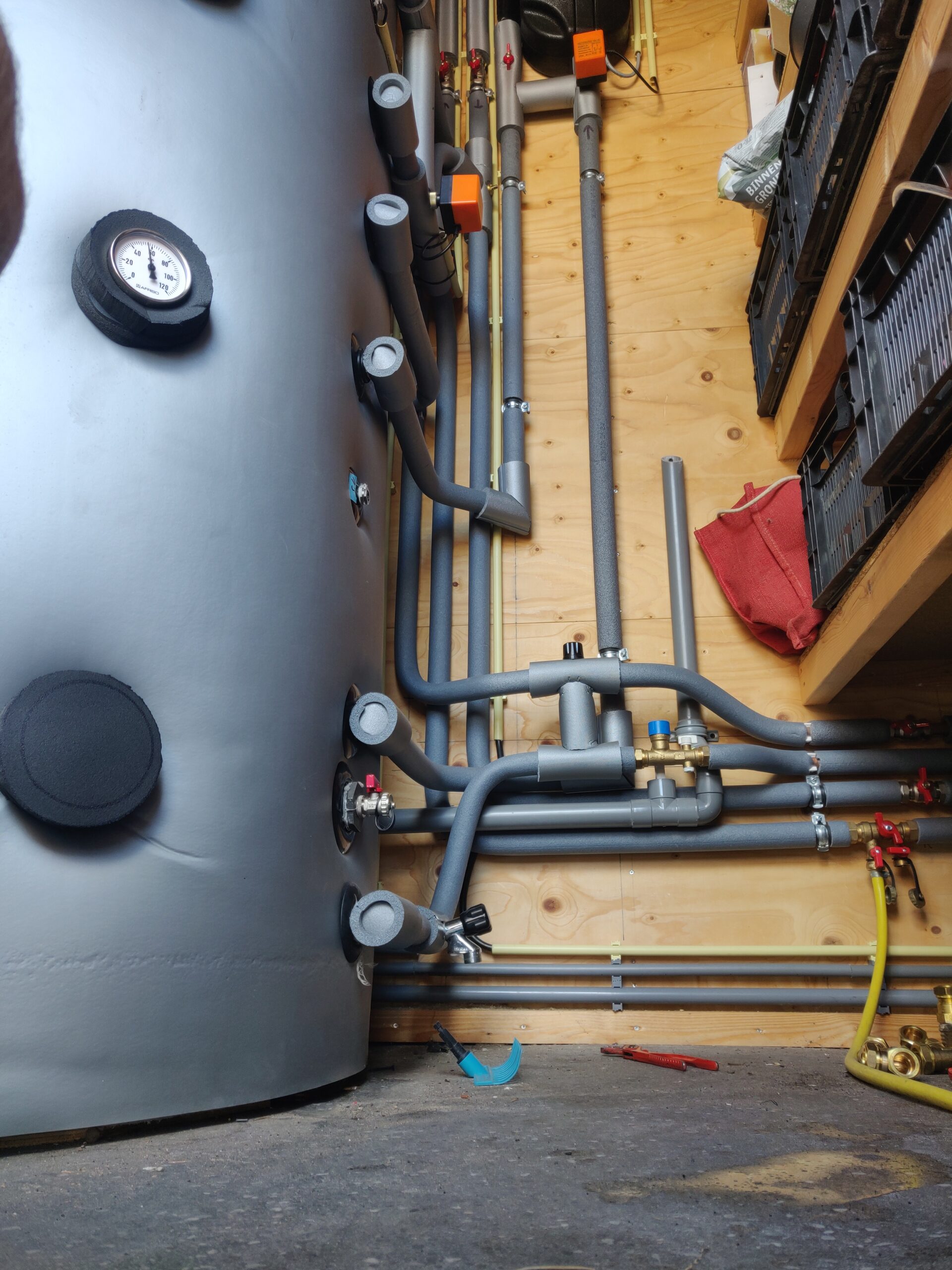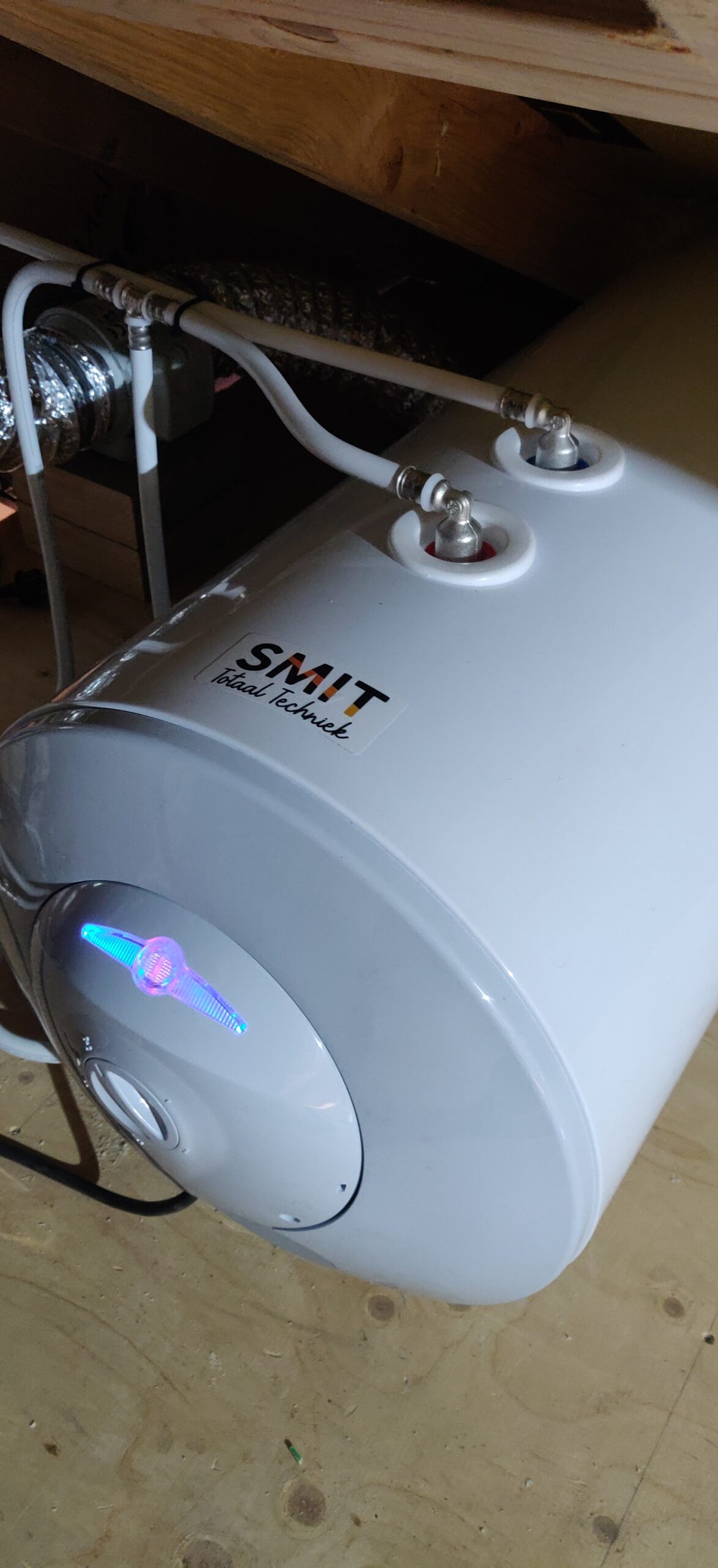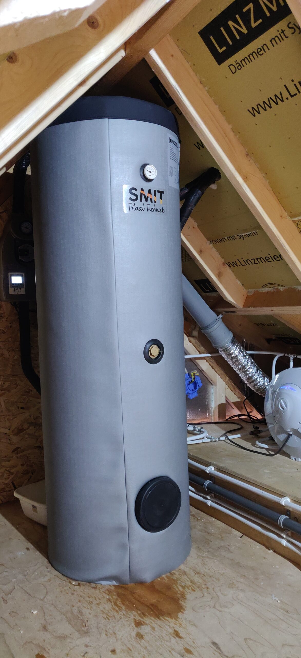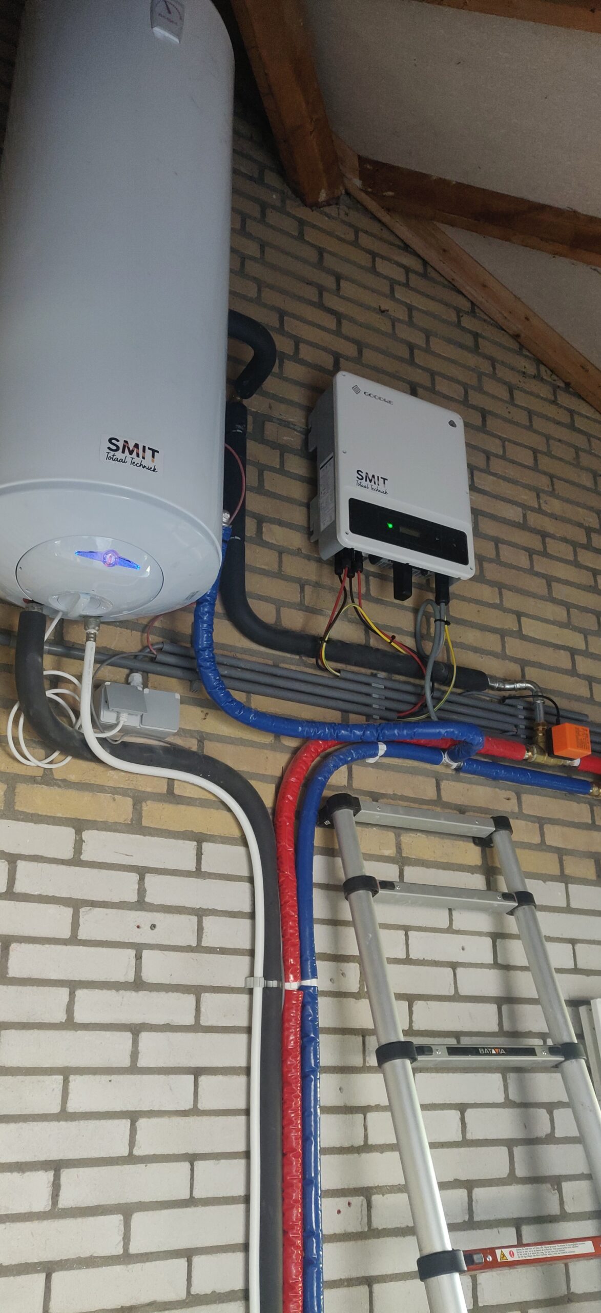 Om fors te besparen op de gasrekening en al vast de eerste stap te zetten naar gasloos wonen, hebben we een zonneboiler systeem geplaatst in de nieuwbouw van een arbeiderswoning. De zolder was net hoog genoeg om te boiler te plaatsen. Het na-verwarmen, als er minder zon is en er wel behoefte is aan warm tapwater, hebben we met een liggende, elektrische boiler gedaan. De aansluitingen in de nieuwe badkamer hebben we ook gemaakt, met twee tijdelijke leidingen naar de bestaande badkamer.