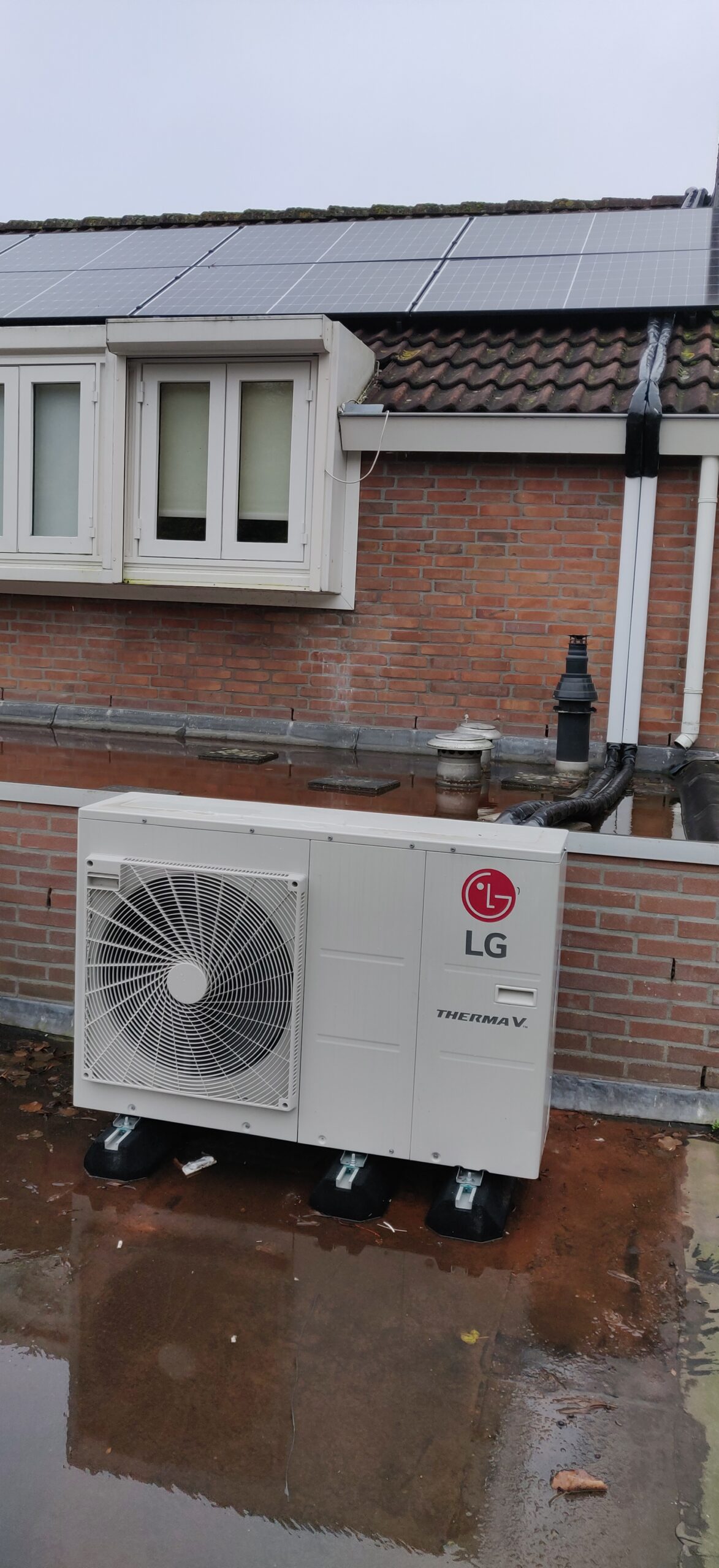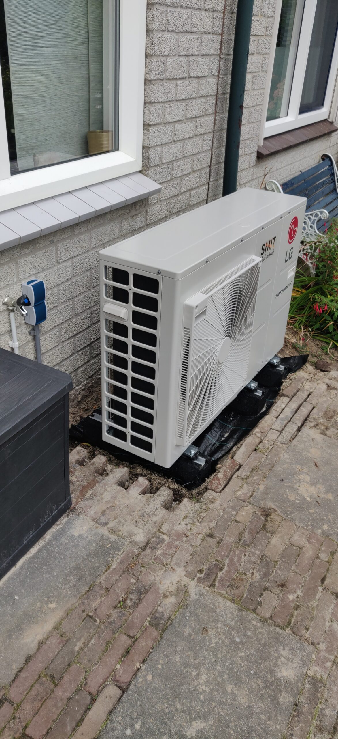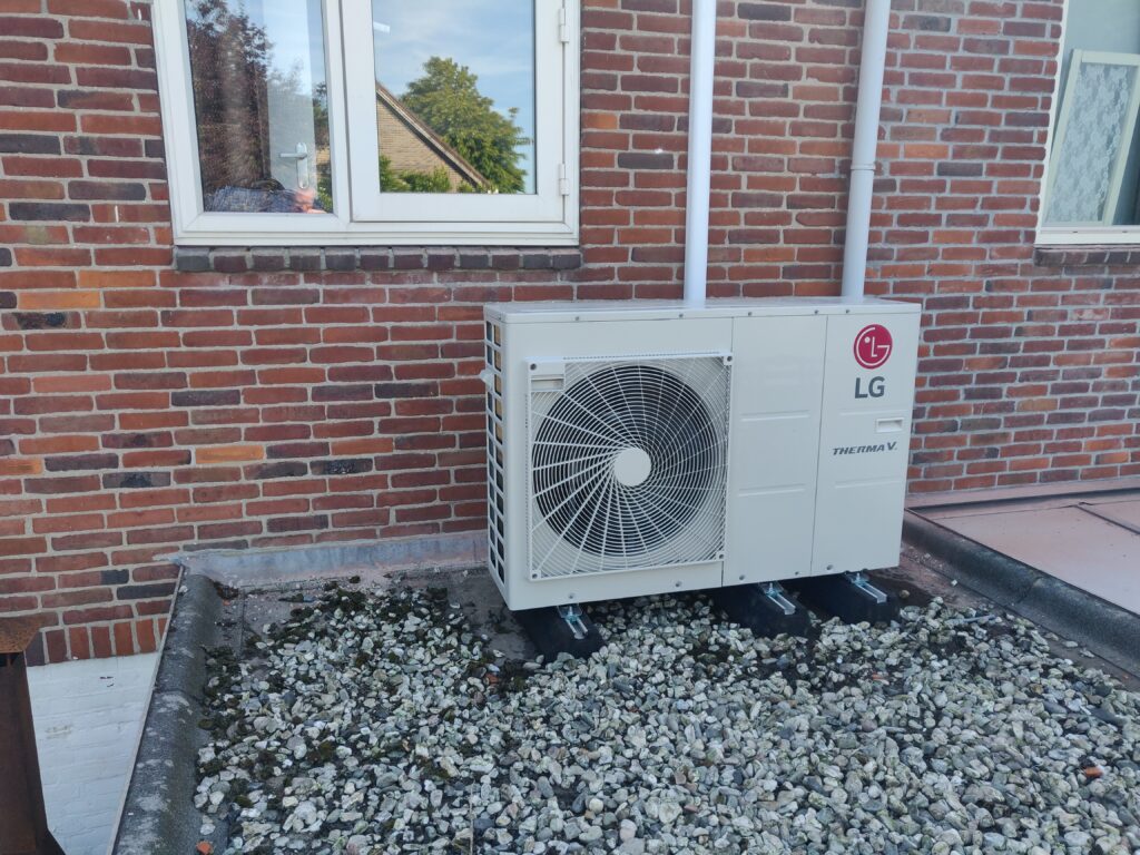 Aan de achterzijde van de woning hebben we een LG ThermaV warmtepomp geplaatst om het huis goed op temperatuur te houden.