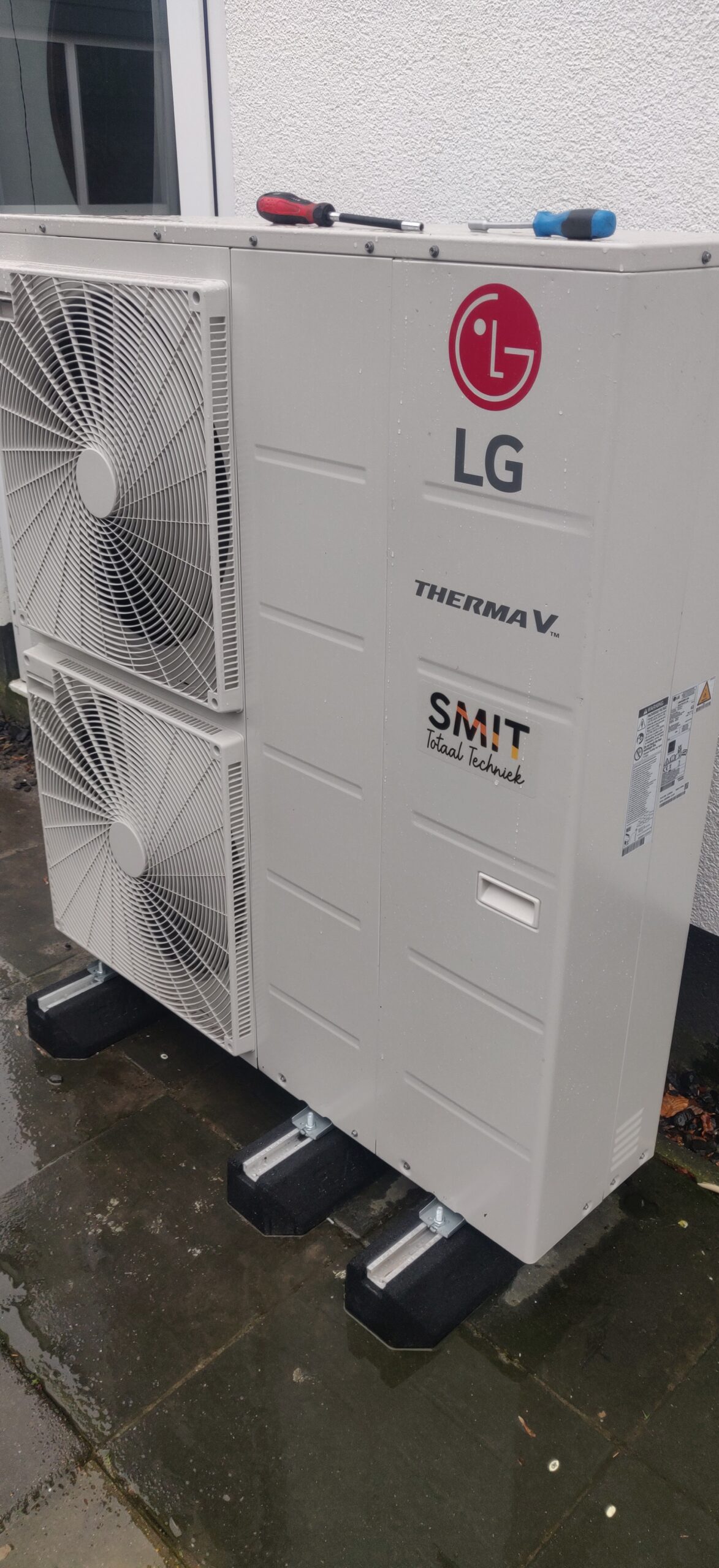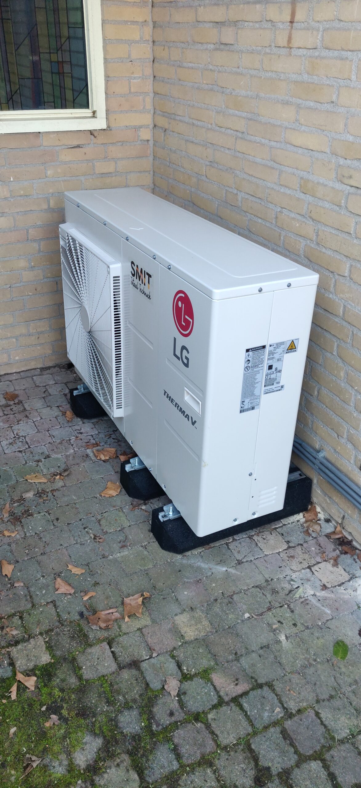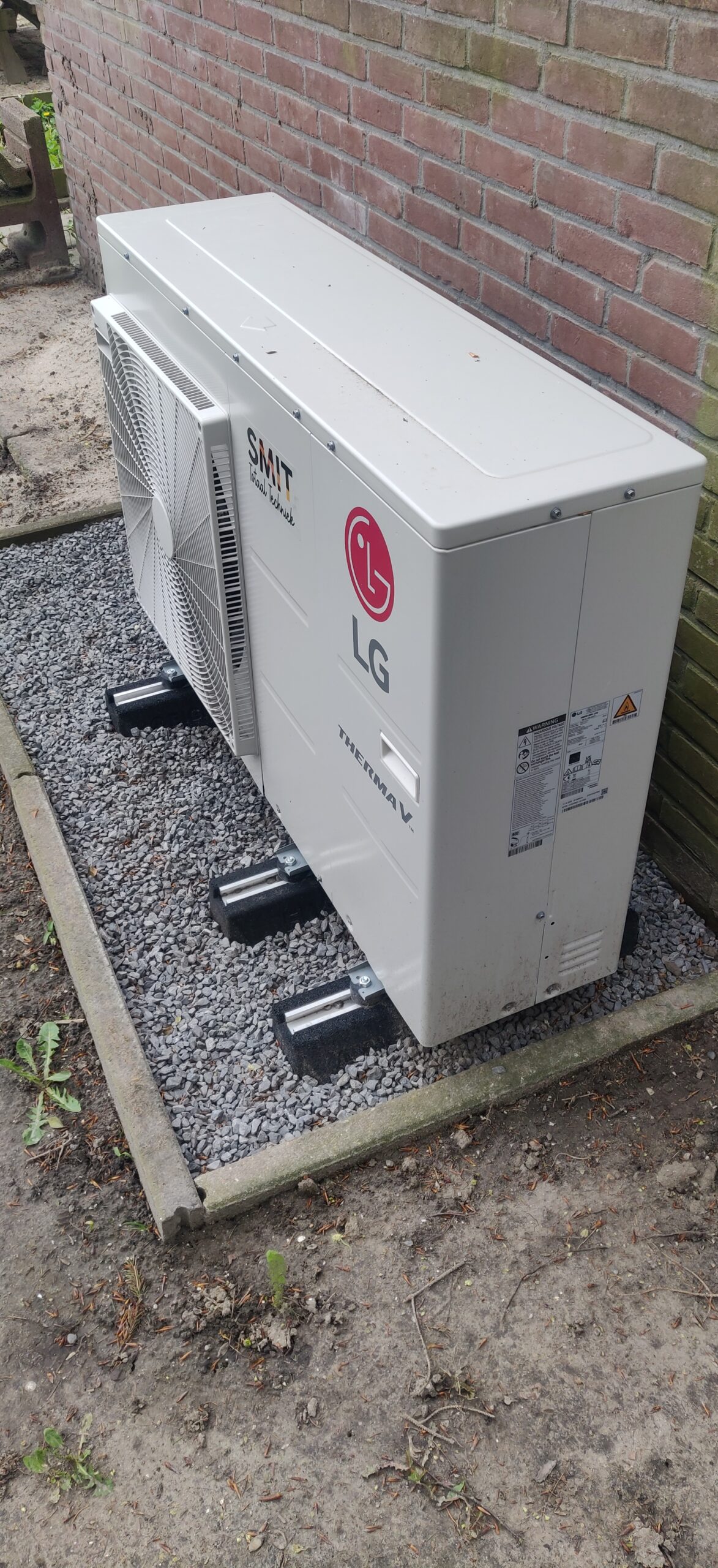 Aan de achterzijde van de woning hebben we een LG ThermaV warmtepomp geplaatst om het huis goed op temperatuur te houden.